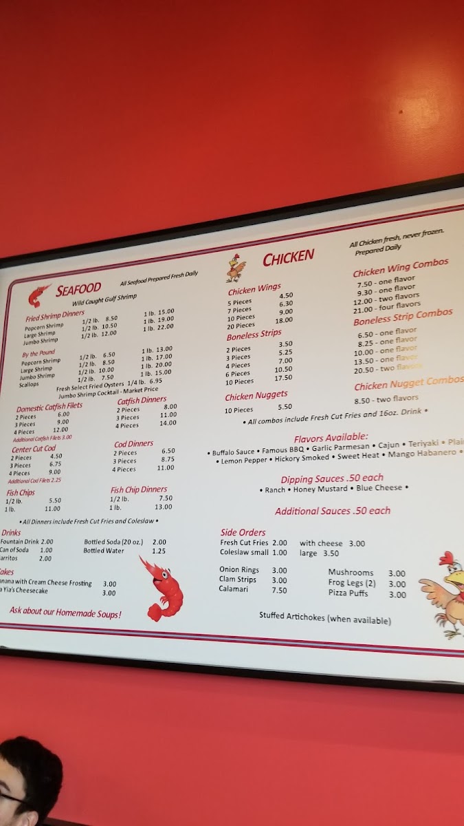 Tender catfish fillets, choice of cocktail, hot, or tartar sauce.